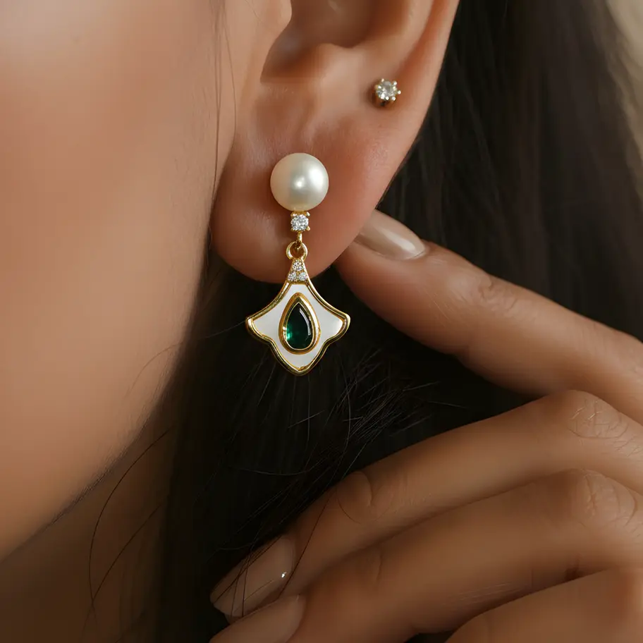 Discover the art of subtle luxury. The Luna Emerald Drop is a study in light and texture. Anchored by a lustrous, genuine Freshwater Pearl stud, this piece transitions effortlessly into a handcrafted fan-shaped drop inlaid with natural Mother of Pearl. The pristine white iridescence is pierced by a vivid, pear-shaped Green Emerald (simulant/onyx), framed by a halo of micro-pave crystals. Lightweight, dainty, and undeniably elegant—it is a modern heirloom for the woman who speaks softly but leaves a lasting impression.