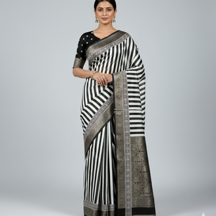 Color: Striking black and white stripes with a black and silver zari border.